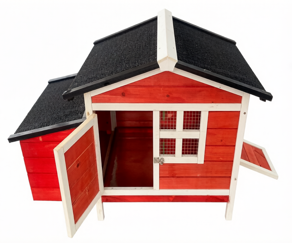 | Description | This chicken coop is a well-built structure designed for housing chickens. It has a main compartment with an openable door and a window with a grid pattern, providing both access and ventilation. The roof is sloped, which helps in water runoff. The construction appears to be made of sturdy materials, ensuring durability. There is also an extended part attached to the main structure for additional space or specific functions like roosting or nesting. The overall design is practical and functional for keeping chickens in a controlled environment. | |||