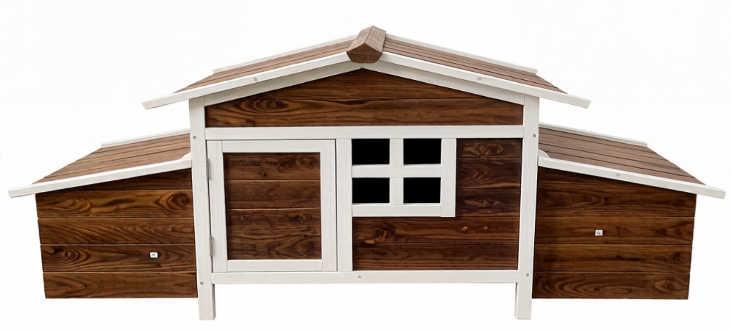 | Description | This double egg storage chicken coop is a well-designed structure tailored for housing chickens. It features a main section with two distinct egg storages, each with an openable door for easy access to collect eggs. The front facade includes a window with a grid pattern, which not only provides ventilation but also allows light to enter the coop. The roof is sloped, facilitating water drainage and protecting the interior from rain. Constructed from sturdy materials, the coop ensures durability and stability. The extended sections on either side of the main structure offer additional space, possibly for roosting or nesting. Overall, the design is practical and efficient for managing a small flock of chickens. | |||